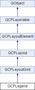 Since QCPLegend derives from QCPLayoutGrid, it can be placed in any position a QCPLayoutElement may be positioned. The legend items are themselves QCPLayoutElements which are placed in the grid layout of the legend. QCPLegend only adds an interface specialized for handling child elements of type QCPAbstractLegendItem, as mentioned above. In principle, any other layout elements may also be added to a legend via the normal QCPLayoutGrid interface. See the special page about The Layout System for examples on how to add other elements to the legend and move it outside the axis rect.