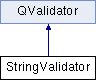 The StringValidator class validates strings by searching for a case-insensitive partial or exact match in a QAbstractItemModel.